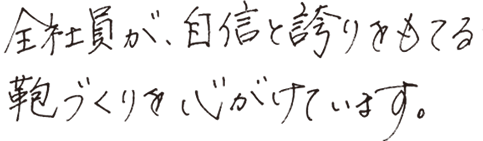 私だけではなく、すべての社員が自信と誇りをもてる鞄づくりを心がけ、責任ある製品を廉価に提供することをモットーに歩み続けてきました。皆の努力による一つひとつの積み重ねが、今日に至る確かな道になっていると感じています。